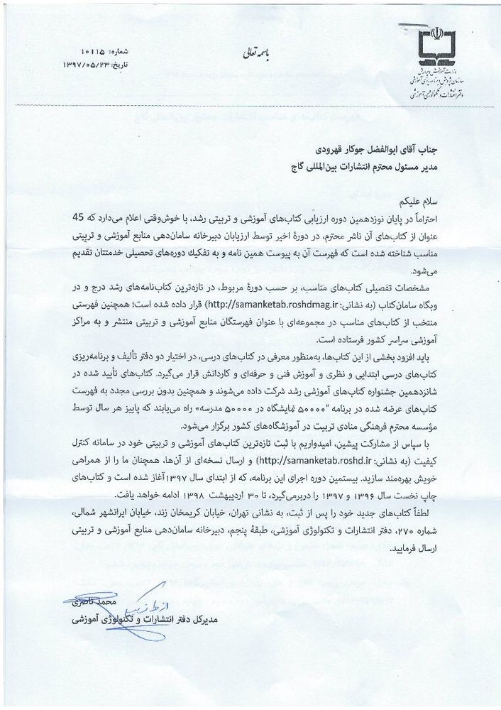 سند اراده شده از سوی گروه آموزشی جوکار به مهر که نشان از تایید آثار این ناشر توسط وزارت آموزش و پرورش دارد